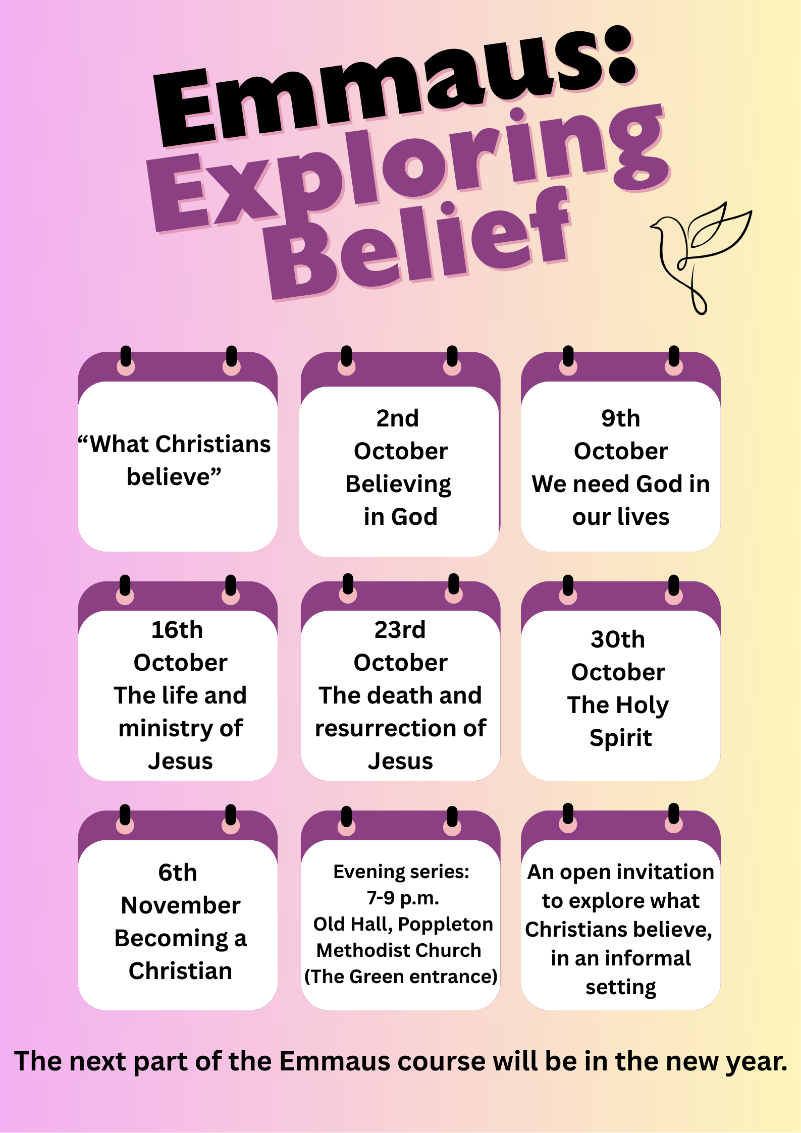 Please note services will be held in the New Hall from the 17th August. This is due to Phase 2 of the Ruach Project building work starting week commencing Monday 18th August.
