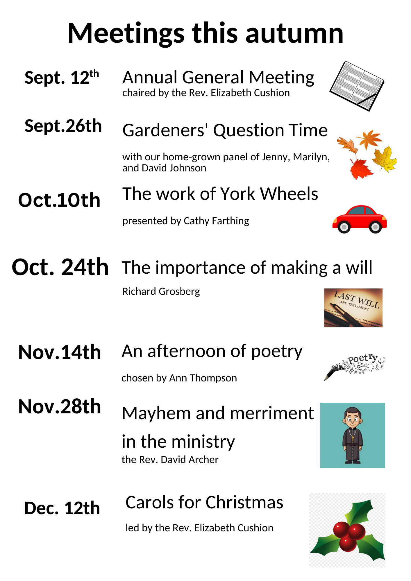 The Friday Fellowship is a friendly, welcoming group, with a Christian ethos. It is open to both men and women. We suggest a contribution of £2 per meeting. The programme has a variety of topics, and refreshments are served at the end, to give a chance to chat, to greet old friends and new. It does not matter how many meetings you can attend. If something is of interest, then do pop in.